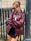 An elegant oversized jacket for women, made from sustainable leather, ideal for those who value both style and sustainability. The jacket has a relaxed and comfortable fit that provides good freedom of movement and suits a wide range of different outfits. It features a timeless collar, a zip closure, and cuffs with buttons, giving it a sophisticated look. The sustainable leather adds a contemporary appearance and ensures the jacket is environmentally friendly. Perfect for daily use, festive occasions, or as a stylish supplement to modern outfits.