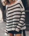 Featuring a classic black and white striped design that effortlessly combines elegance with casual flair. Made from high-quality mohair, this sweater delivers a luxuriously soft and fluffy feel, keeping you warm and stylish.