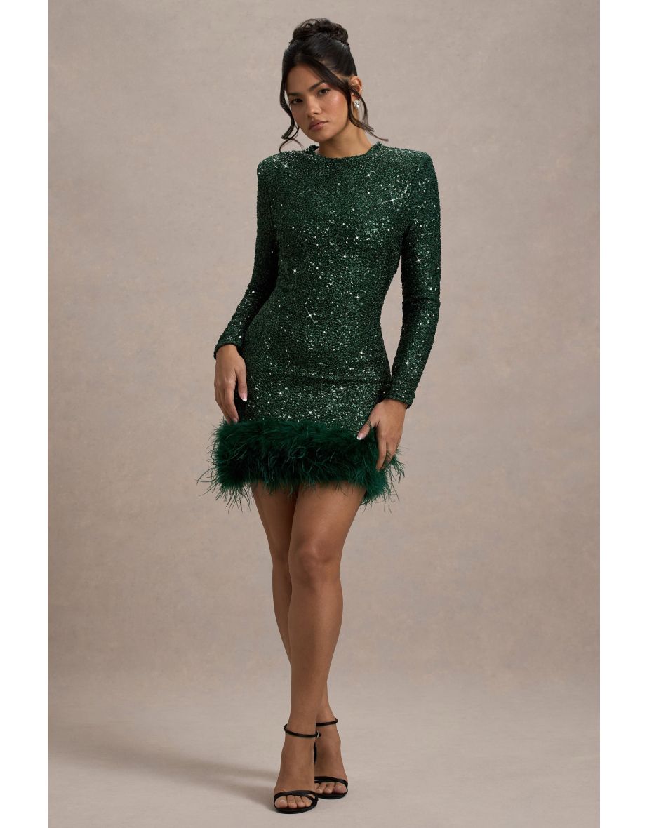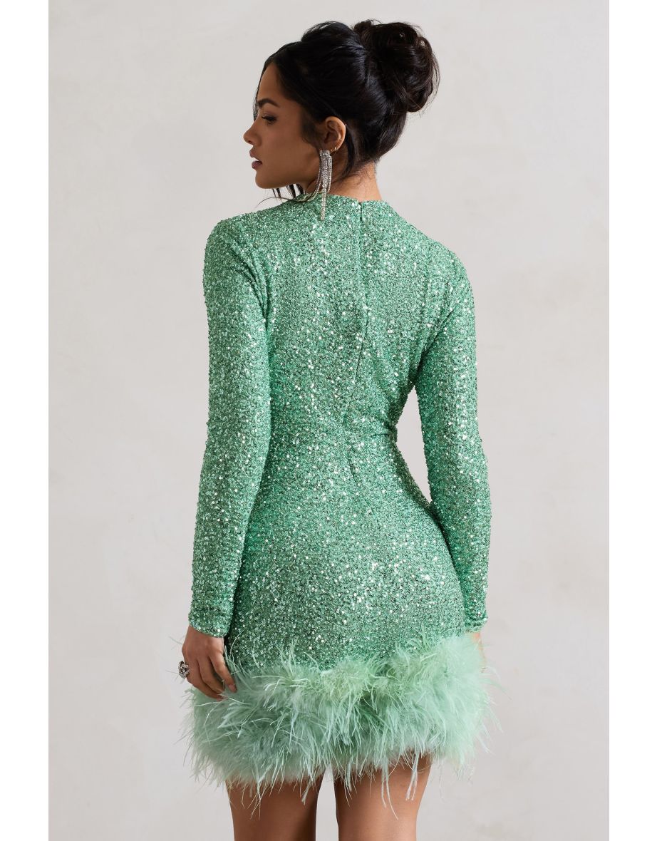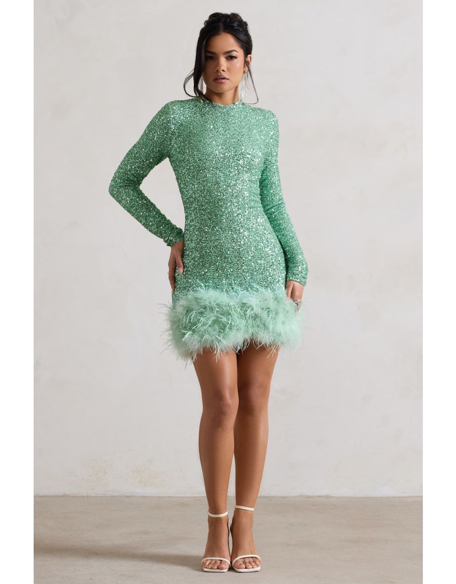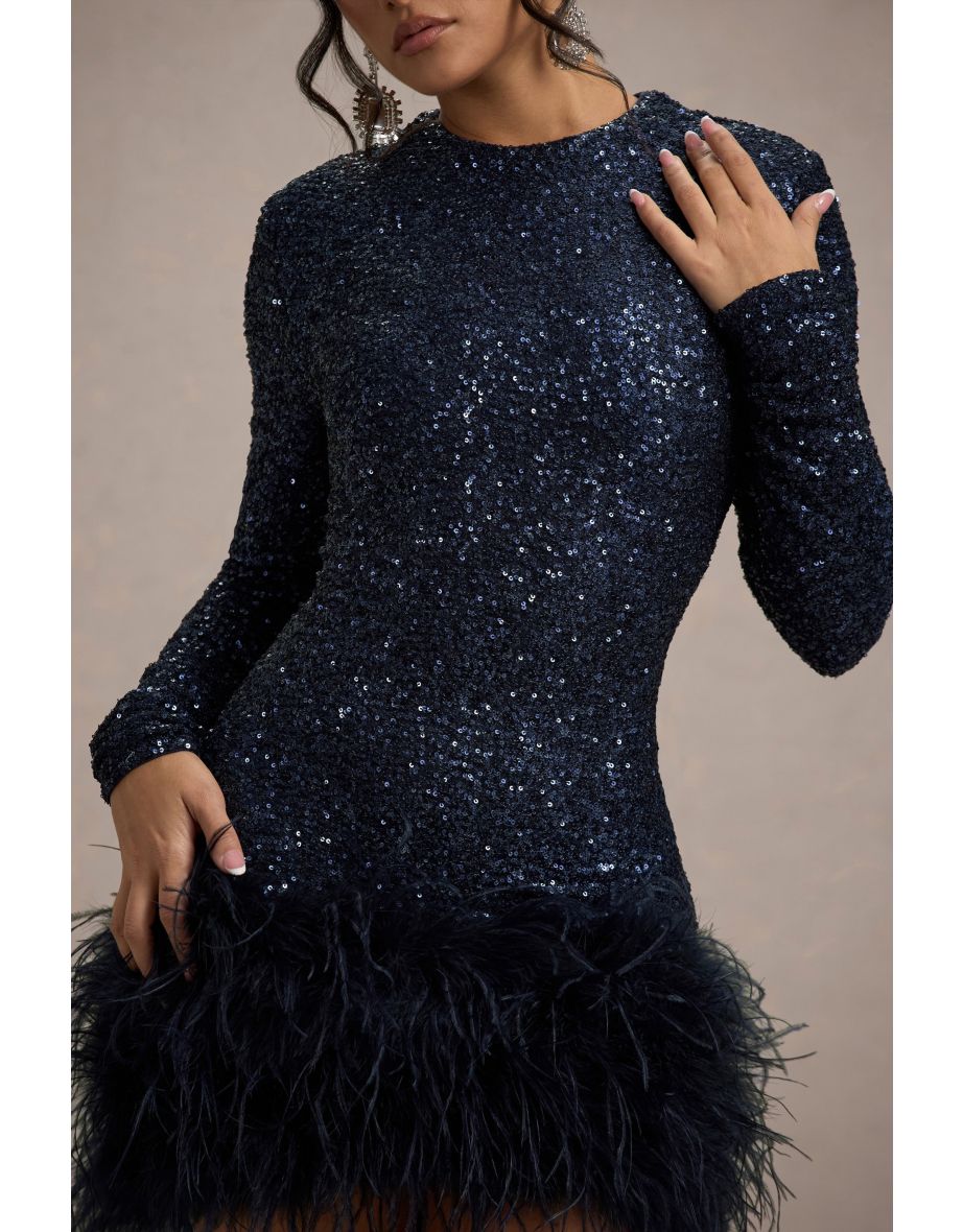 Step into the spotlight with the Out-Shine™ | Berry Sequin High Neck Feather Hem Mini Dress With Long Sleeves. Ideal for the celebration season, this captivating mini dress seamlessly merges elegant charm with whimsical sparkle. The opulent berry sequins, elevated neckline, and extended sleeves form a sleek profile, while the feather-trimmed hem and tailored shoulder pads introduce a theatrical touch. Crafted to enthrall,Out-Shine guarantees that all attention is focused on you at your next important occasion.