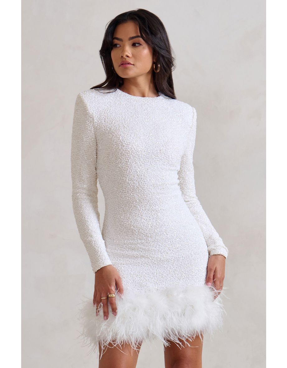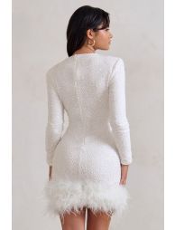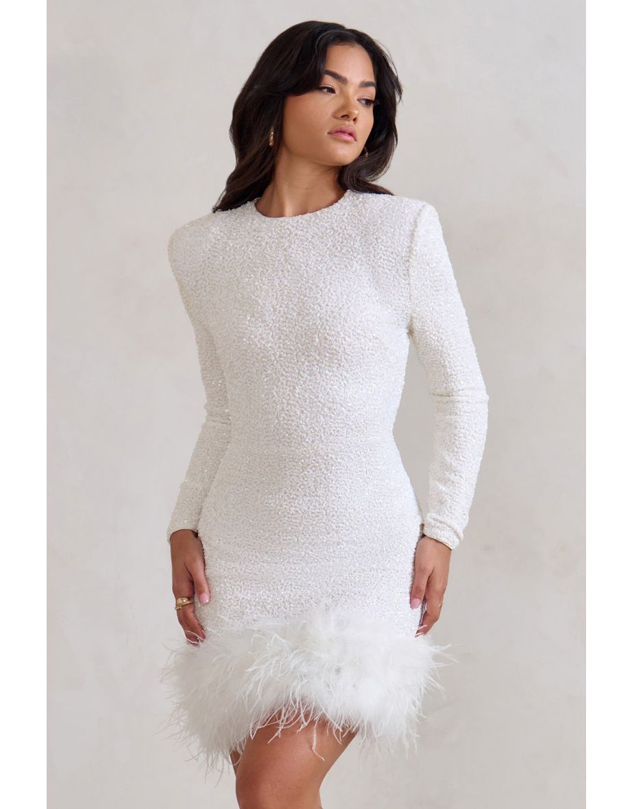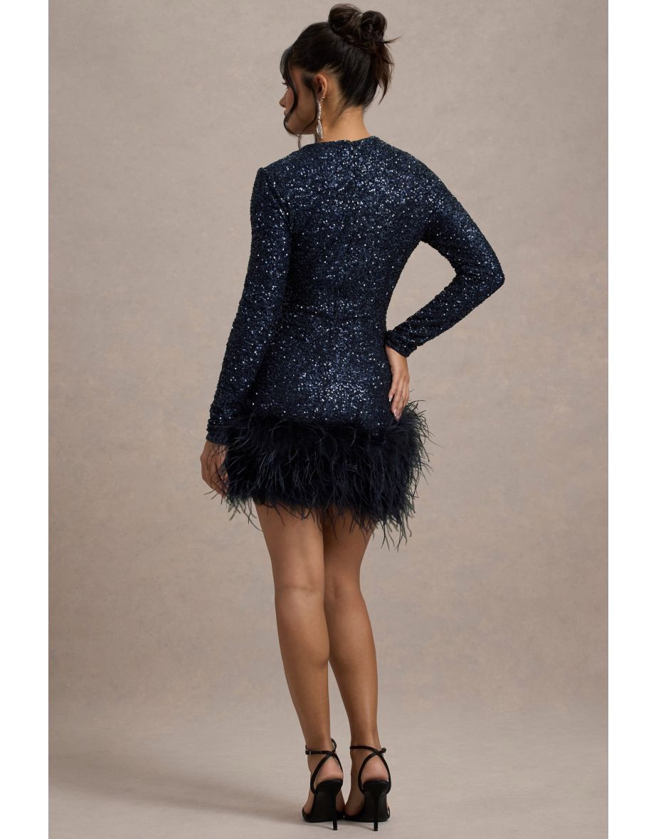 Step into the spotlight with the Out-Shine™ | Berry Sequin High Neck Feather Hem Mini Dress With Long Sleeves. Ideal for the celebration season, this captivating mini dress seamlessly merges elegant charm with whimsical sparkle. The opulent berry sequins, elevated neckline, and extended sleeves form a sleek profile, while the feather-trimmed hem and tailored shoulder pads introduce a theatrical touch. Crafted to enthrall,Out-Shine guarantees that all attention is focused on you at your next important occasion.
