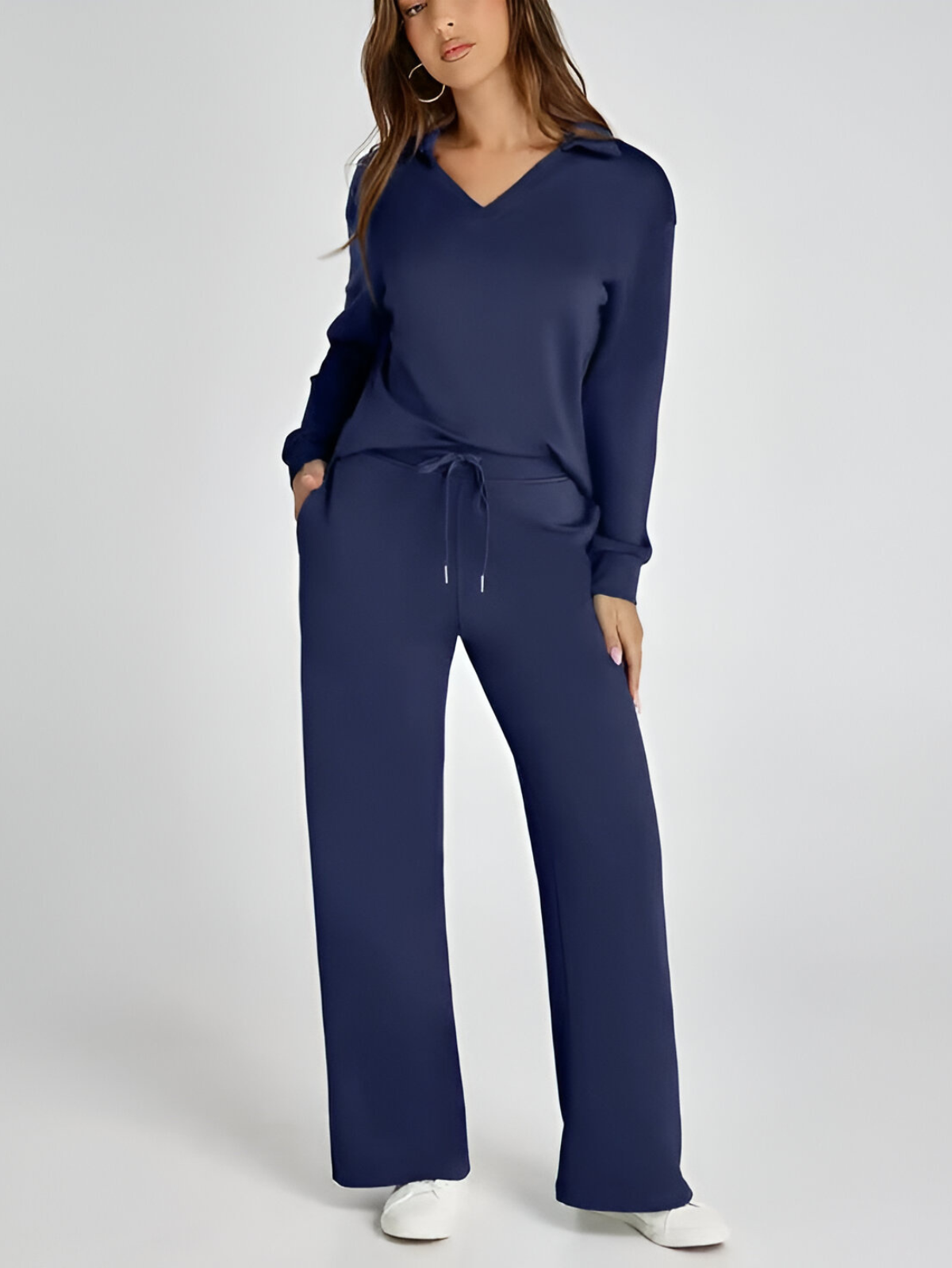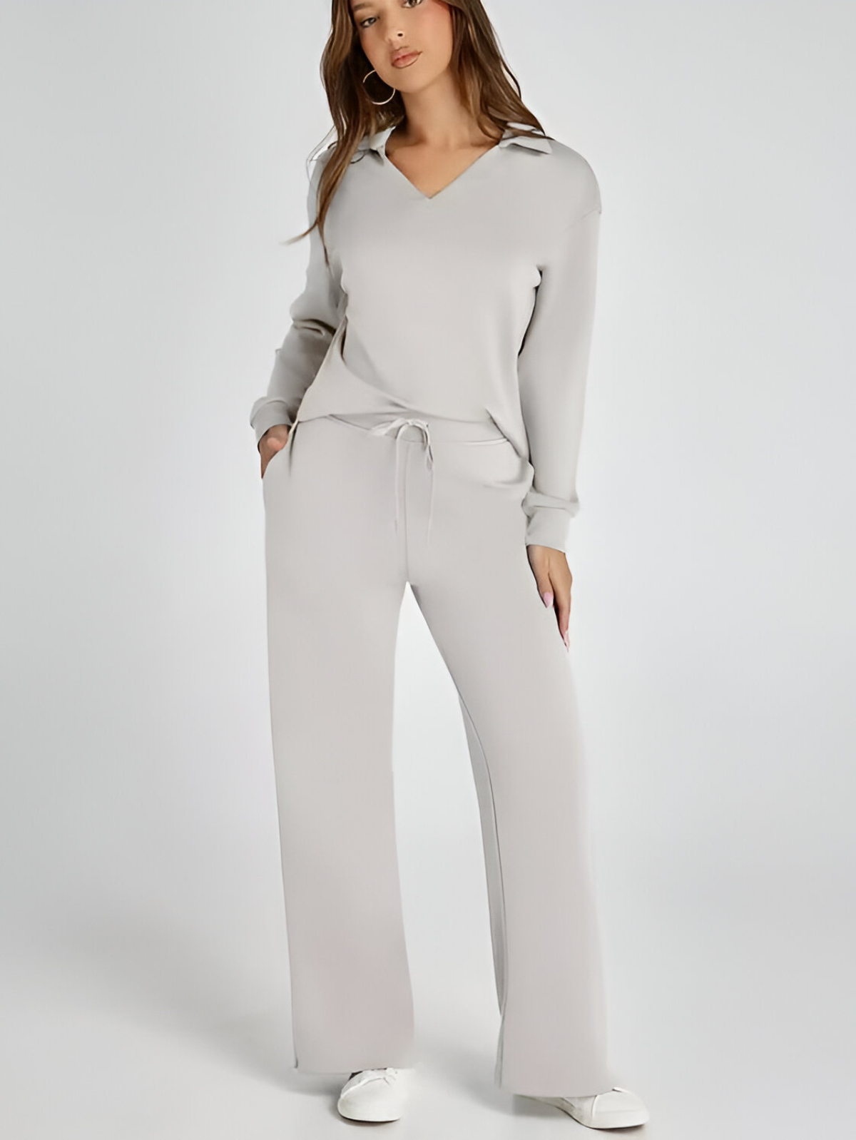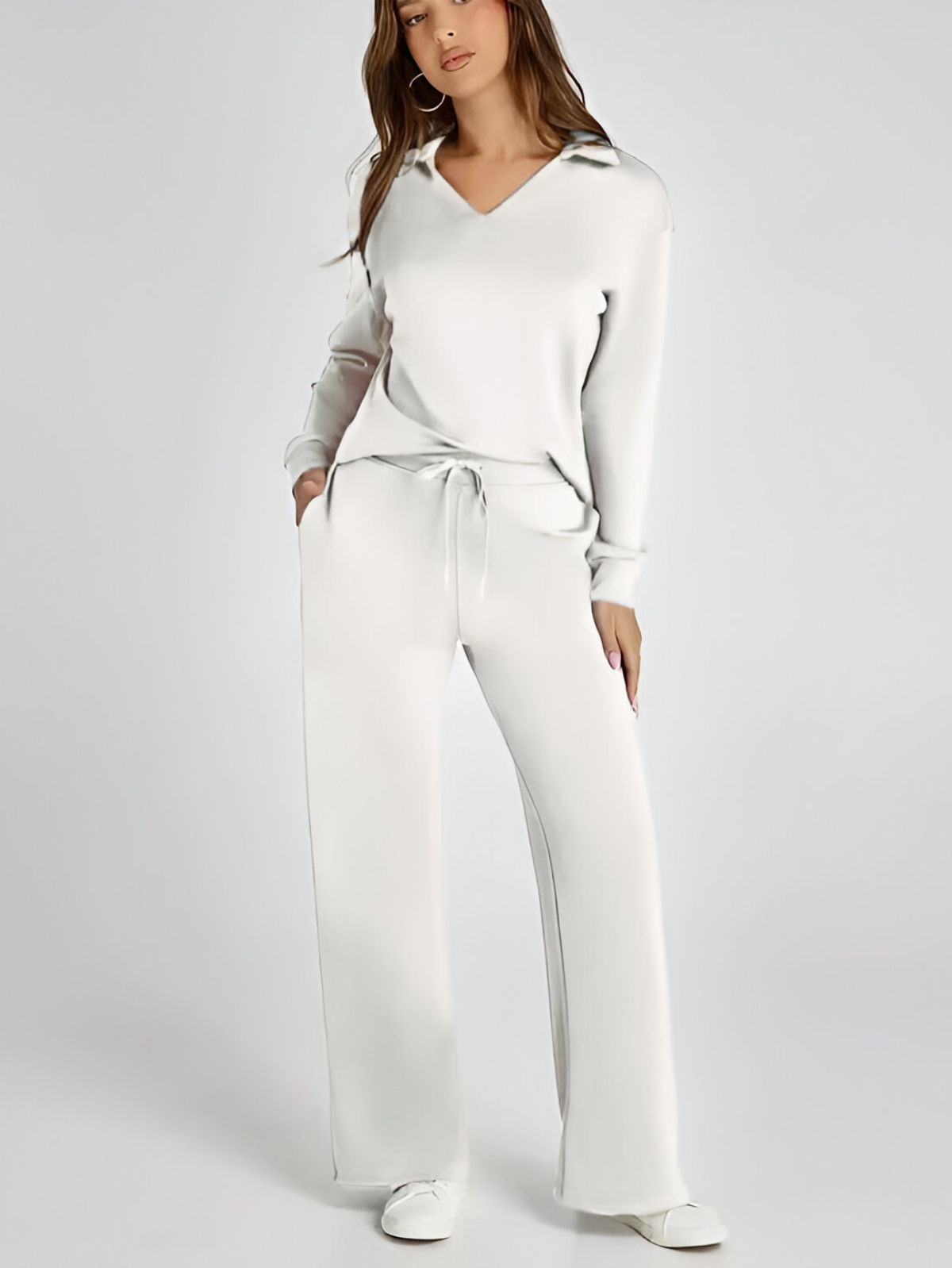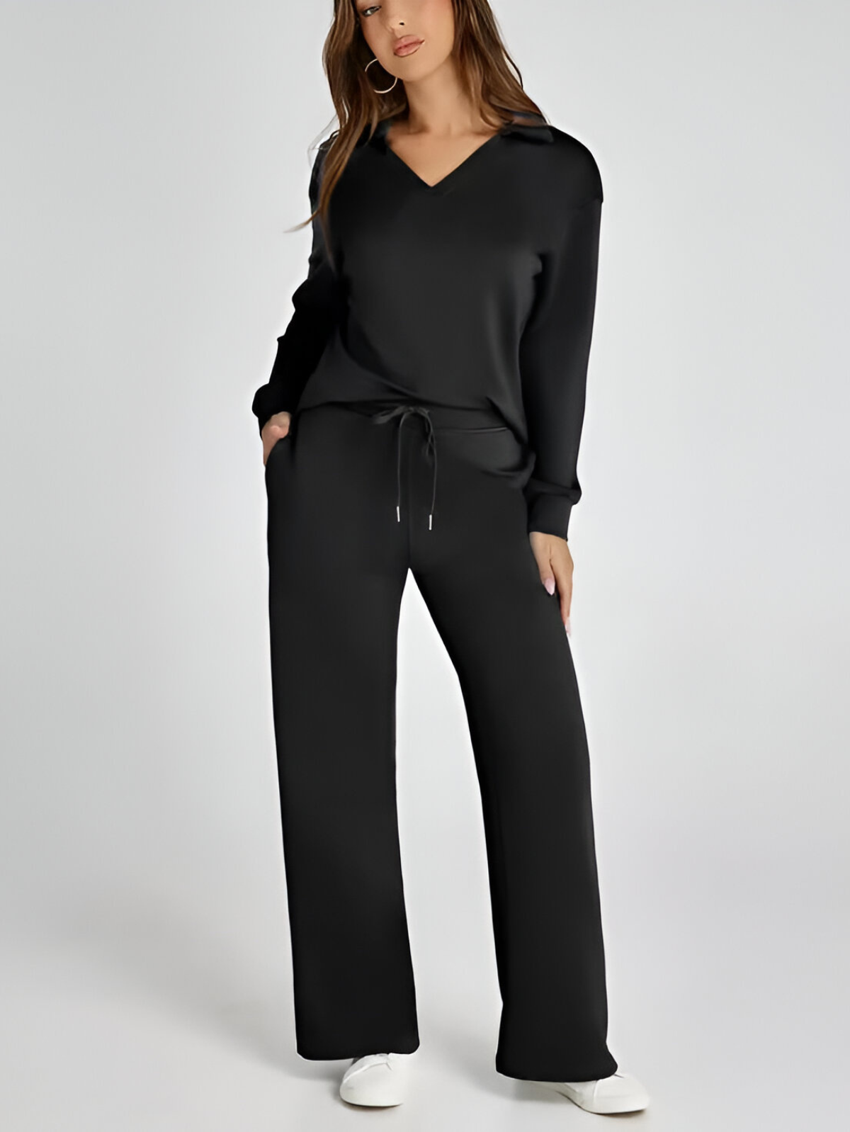 Effortlessly stylish and remarkably comfortable, the Ivyshape Casual Long Sleeve Set is the perfect option for easygoing, trendy outfits. Its appealing V-neck cut and high-waisted, wide-leg trousers make it an excellent match for both casual and sporty looks.