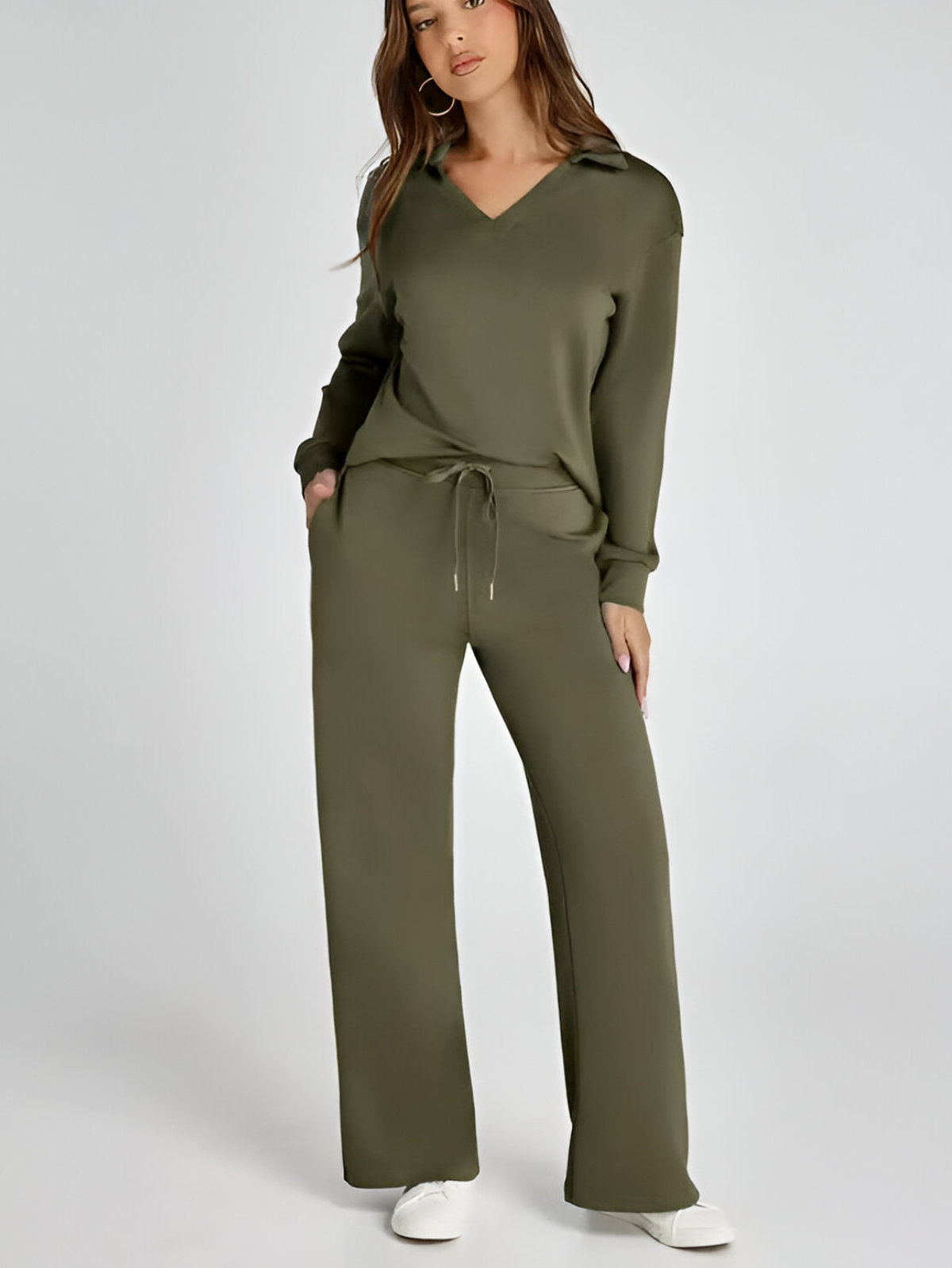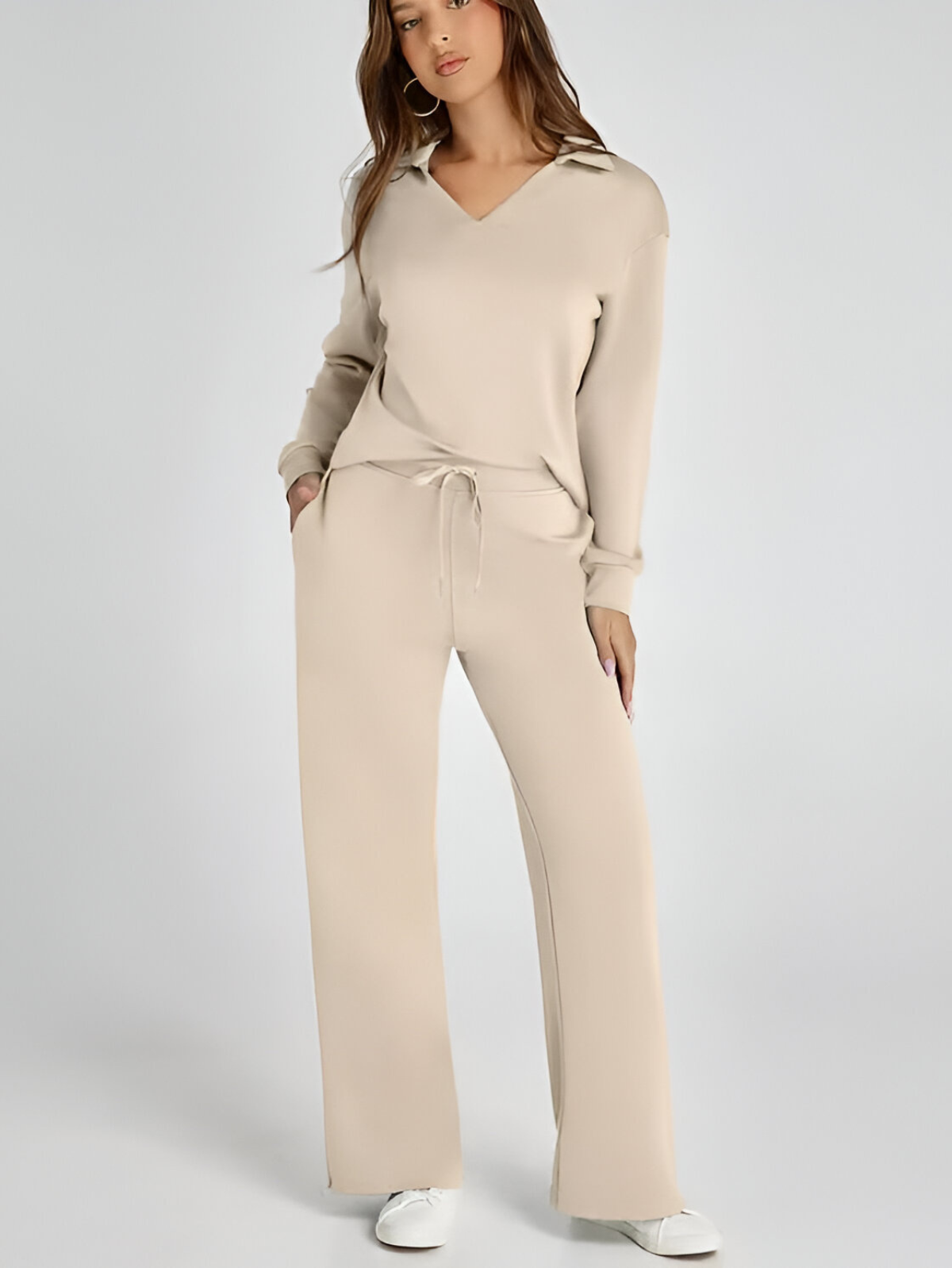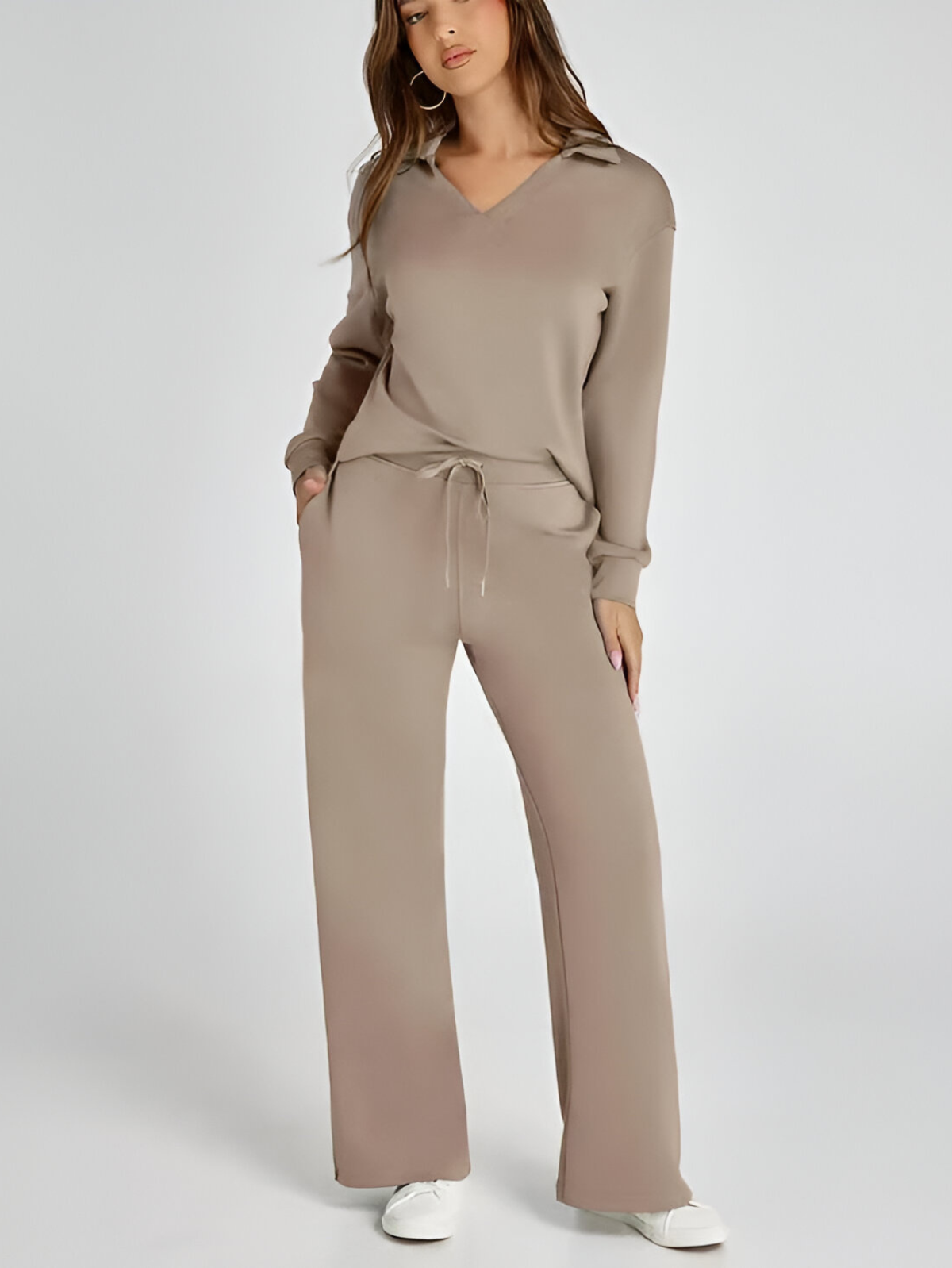 Effortlessly stylish and remarkably comfortable, the Ivyshape Casual Long Sleeve Set is the perfect option for easygoing, trendy outfits. Its appealing V-neck cut and high-waisted, wide-leg trousers make it an excellent match for both casual and sporty looks.